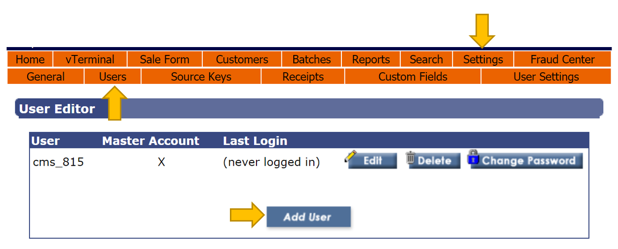 This article will walk you through how to create an additional user within the Complete Gateway. Once logged in you will find a series of tabs listed at the top of the screen, select the Settings tab. A sub menu will appear with additional tabs, select the Users tab. This screen will show all users currently available within the gateway. From here select the Add User button.