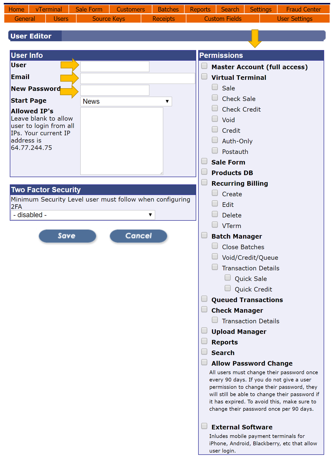 The Permissions section will allow you to provide difference access points to the user within the gateway. If you would like this user to only have access to reporting you will select the Reports option. If you would like the user to only run sales transaction, select the Sale option under the Virtual Terminal section.