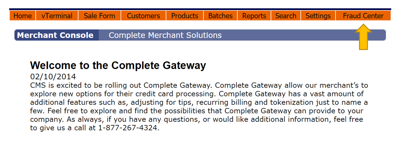 Log into your Complete Gateway and select the "Fraud Center" tab at the end of the home screen.